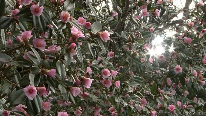 ピンクの花びらが特徴的な色鮮やかな椿。見ごろを迎えた、「太郎冠者」と呼ばれる品種です。