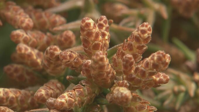 三重県亀山市、東名阪自動車道の亀山ジャンクション付近。多くのスギの木が植えられていますが、一部の枝は黄色っぽくなっていて、いつ花粉が飛んでもおかしくない状態に。スギ花粉は、数十キロから数百キロ飛散す…