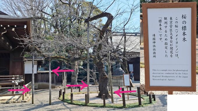 3月に入ると気になってくるのが桜の開花の時期。毎年、桜の咲く時期になると東京・靖国神社の標本木の前にはマスコミや参拝客が集まり、気象庁職員の桜の開花宣言の発表を聞くというのが恒例になっています。