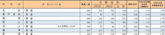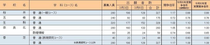 学校・コース別で倍率を見ると、市立一条高校が1.48倍、奈良高校は1.21倍、郡山高校は1.26倍、桜井高校は1.17倍となっています。県立高校全体の平均倍率では、1.00倍となっています。