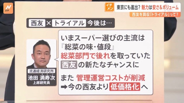 西友とトライアルの今後について、流通経済研究所の池田満寿次上席研究員によると「いまスーパー選びの主流は『惣菜の味・値段』。惣菜部門で後れを取っていた西友の新たなチャンスになるのではないか。また、管理運営コストが削減し、今の西友より低価格化できるかもしれない」ということです。