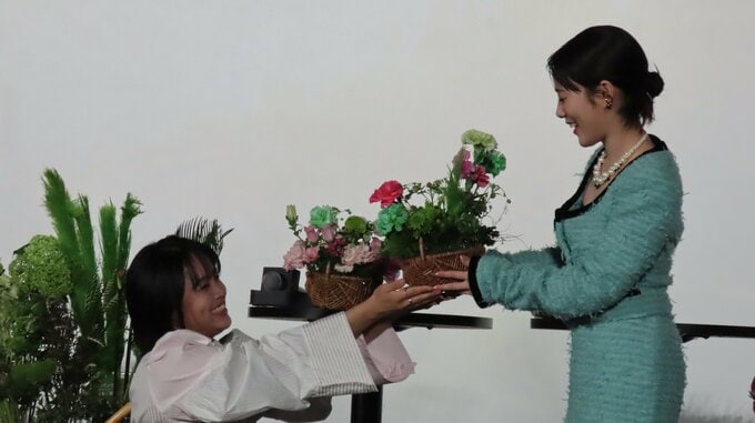 今回のイベントでは、「友情の証」としてフラワーアレンジメントを制作し、高畑さんは清水さん、清水さんは高畑さんにプレゼントすることに。お互い渡す際に互いに跪いて交換して会場を沸かせると、高畑さんは “ピンクと緑のコントラストがはっきりしていてすごい素敵です。猫に食べられないようにトイレにしか置けないんですけど、置かせてもらおうと思います”と笑顔。清水さんは “純粋にお花を貰うのってこんなに嬉しいんだなって実感しました”と微笑みました。