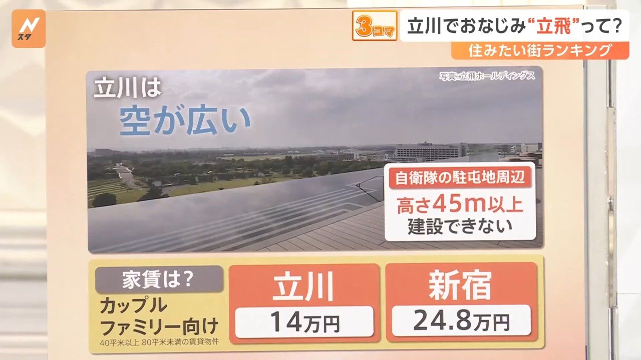 家賃の相場も、カップルファミリー向けだと立川は14万円、新宿は24.8万円ということで、約10万円も安く抑えられるというメリットもあります。