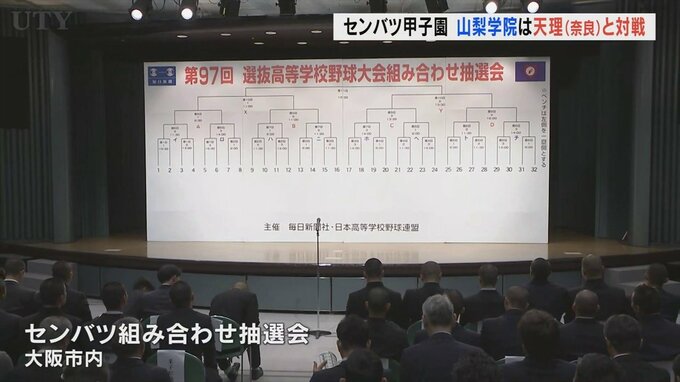 今月18日に開幕する春のセンバツ甲子園の組み合わせ抽選会が行われ、2年ぶりの優勝を目指す山梨学院高校の対戦相手が奈良の天理高校に決まりました。