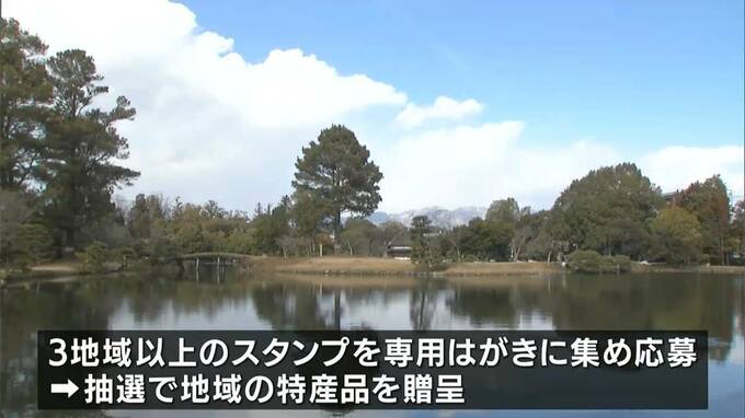 委員会が6つに区切った沿線地域から3地域以上を訪れ、専用のはがきにスタンプを集めて応募すると、抽選で地域の特産品が当たります。はがきはスタンプの設置場所で配布されていて、きょうから5月9日まで応募できます。