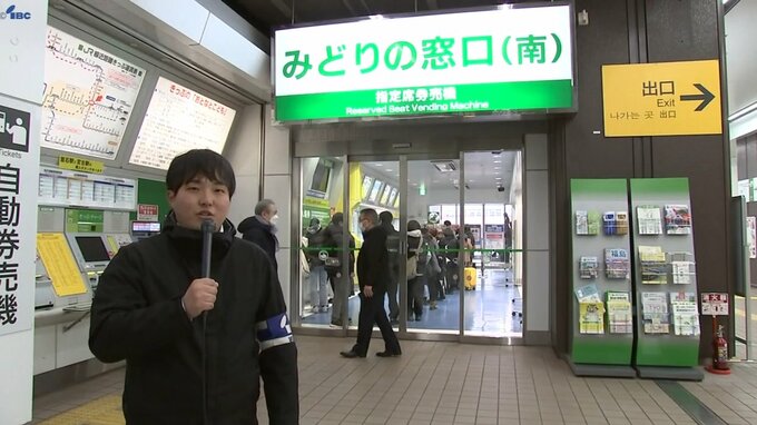 「午前9時過ぎの盛岡駅です。みどりの窓口にはチケットの払い戻しを行う人などで長い列ができています」