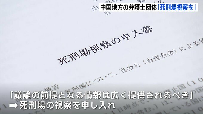 死刑制度に関する情報公開の一環として、中国地方の弁護士でつくる団体が死刑場の視察を申し入れました。申し入れ書を提出したのは、中国地方弁護士会連合会 理事長の坂下宗生弁護士ら5人です。中国地方弁護士会連…