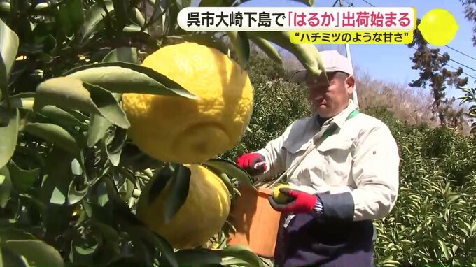 ハチミツのような甘さが人気のかんきつ、「はるか」の出荷が、広島県呉市の大崎下島で始まりました。「はるか」の出荷は、4月中頃まで続き、およそ560トンが出荷される予定です。