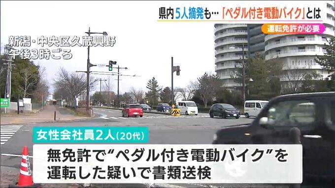 今年1月、新潟市中央区久蔵興野の歩道で、無免許で「ペダル付き電動バイク」を運転した疑いで、新潟市中央区に住む20代の女性会社員2人が書類送検されました。ヘルメットも付けず、ナンバープレートもなかったということです。
