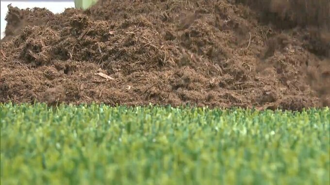 サッカーやゴルフなどの競技場でよく目にする「人工芝」。これを自然にも人間にも優しいものにしようと岡山市の企業が新たな商品を開発しました。岡山市南区のスポーツ用品店。人工芝で従業員がなにやら土のような…