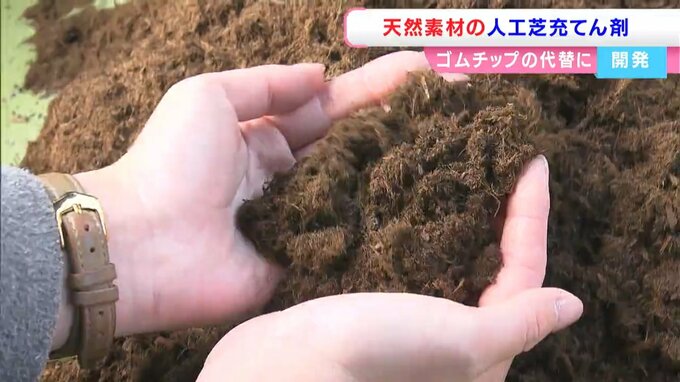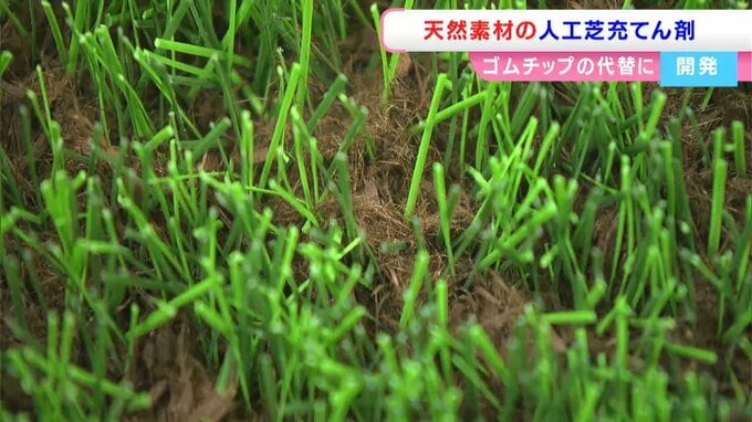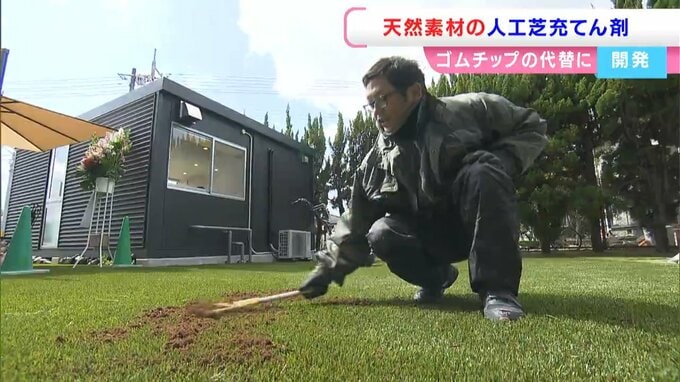 これは、樹皮などの天然素材だけで作られた充填剤。いま、日本で多く使われているのがゴム製のものですが、環境などへの影響があるのではとの懸念から一部の国では使用が禁止されていて、日本でもゴムを使わずに済むようにと開発されました。天然素材を使うことでクッション性が増し、けがを予防することができたり天然の芝に近い使用感を実現したりできるということです。