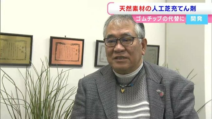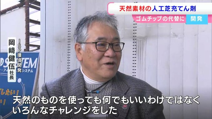サッカーやゴルフなどの競技場でよく目にする「人工芝」。これを自然にも人間にも優しいものにしようと岡山市の企業が新たな商品を開発しました。