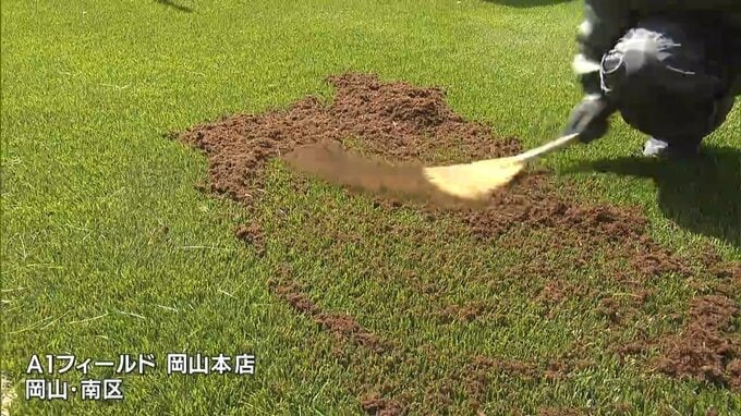 岡山市南区のスポーツ用品店。人工芝で従業員がなにやら土のようなものを撒いています。