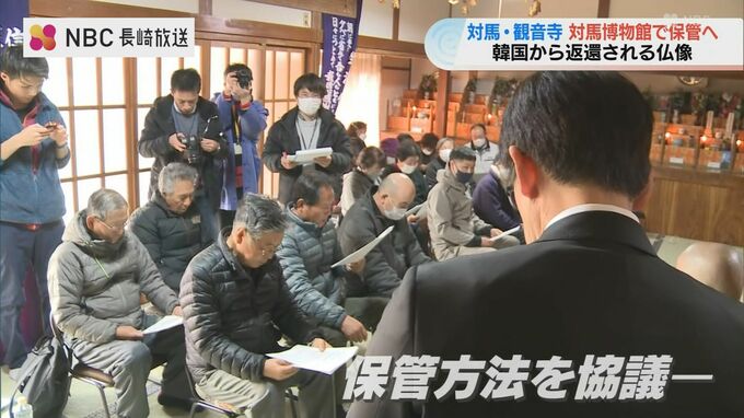 長崎県対馬市の観音寺から勧告の窃盗団によって盗まれ、13年ぶりに返還が決まった仏像の保管方法について7日話し合われました。今後は寺ではなく対馬博物館で保管する方針が決まりました。