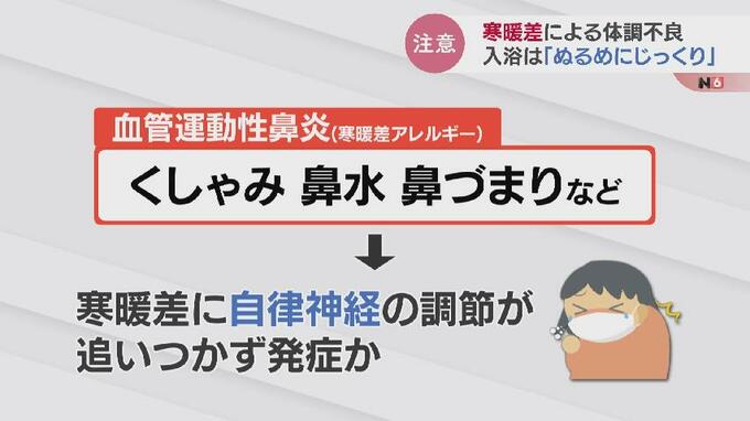 「血管運動性鼻炎」。八木医師によりますと、「寒暖差アレルギー」とも呼ばれ、寒暖差の影響で、アレルギー性鼻炎のようなくしゃみ、鼻水、鼻づまりといった症状がみられるといいます。寒暖差に自律神経の調節が追いつかず、症状が起きると考えられています。
