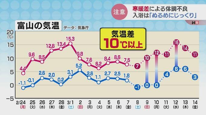 富山県内は来週にかけて暖かくなりますが、朝晩の冷え込みが激しく、1日の気温差が10℃以上となる日も。寒暖差による体調不良に注意が必要です。