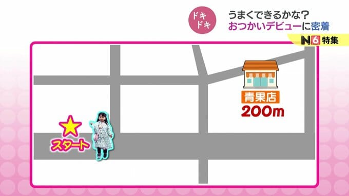 瑚都ちゃんはスタート地点から200メートル離れた青果店に向かいます。