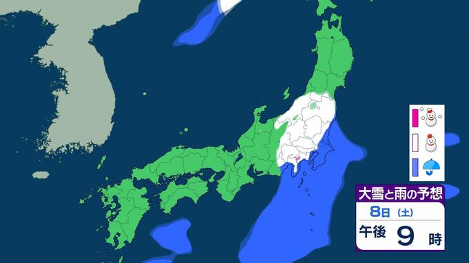 気象庁によりますと、東京地方では、8日夕方~9日にかけて多摩地方を中心に大雪となり、23区でも積雪となる所がある見込みだということです。