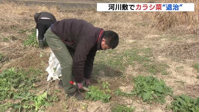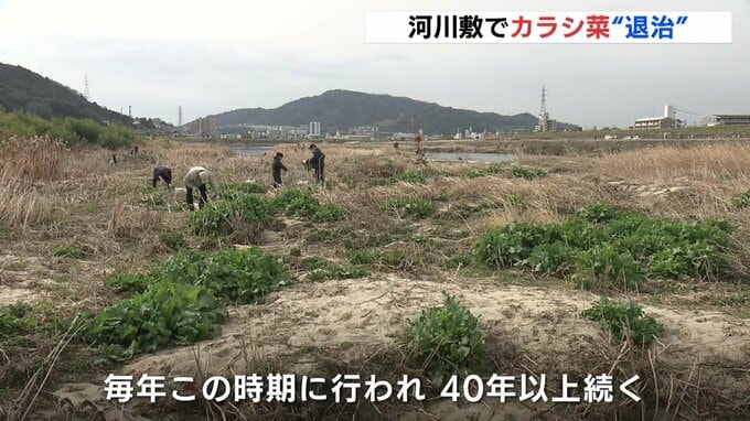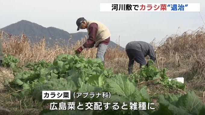 広島の特産、広島菜を守ろうと栽培農家などが太田川河川敷に自生する「カラシ菜」を「退治」しました。