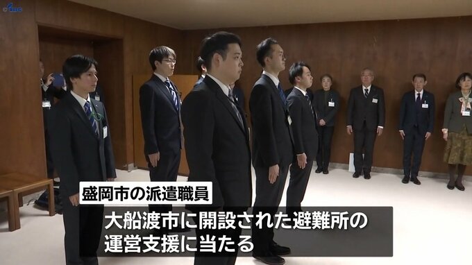 7日は盛岡市役所で派遣職員の出発式が行われました。派遣される職員は資産税課の廣瀬拓磨さんら6人で大船渡に開設された避難所の1つで運営支援を行うということです。