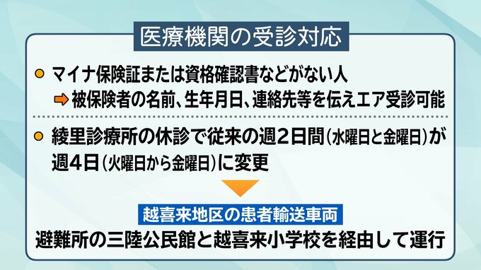 また、綾里診療所が火災で当面の間休診となっていることから、吉浜診療所が従来の週2日間から4日間に変更となっています。これに伴い越喜来地区の患者輸送車両が、避難所の三陸公民館と越喜来小学校を経由して運行しています。