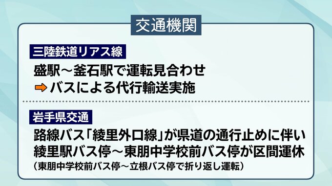 交通機関の情報です。三陸鉄道のリアス線は盛駅から釜石駅の間で運転を見合わせていて、バスによる代行輸送を行っています。