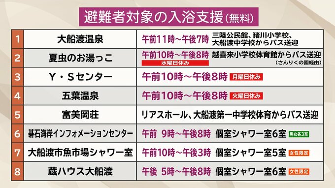 避難している方へ入浴施設や個室シャワーの入浴支援が8つの施設で無料で行われています。一部の施設は避難所からの送迎バスも運行しています。