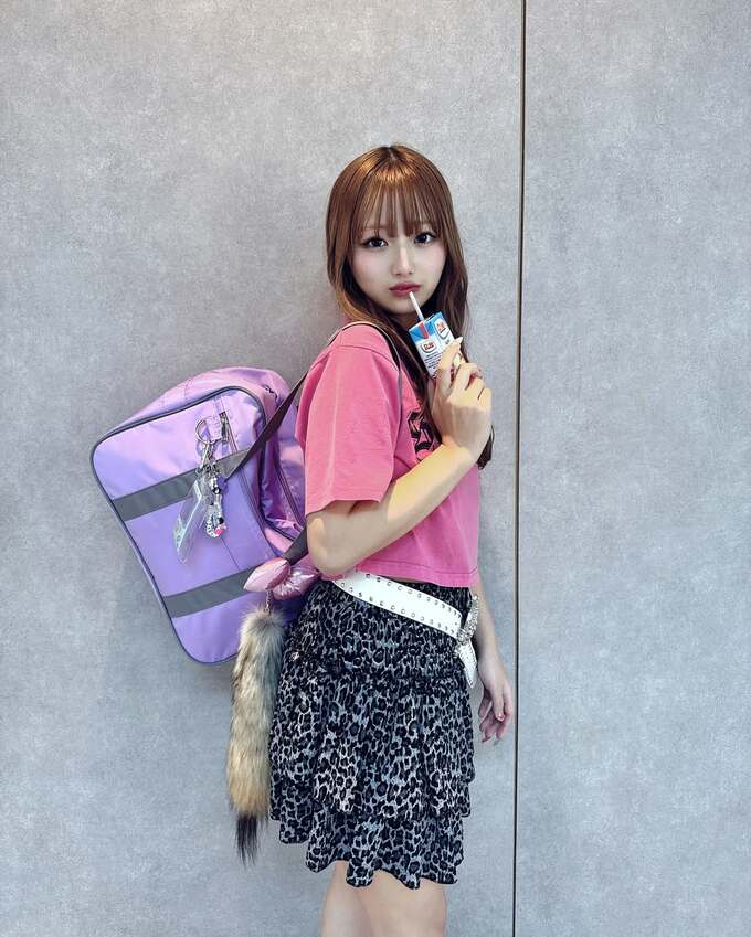 続く写真では、スクバ型のパープルのバックを肩から提げつつピンクのプリントTシャツに白黒柄のミニと白のレザーベルトを合わせ、スポーティめに寄せています。