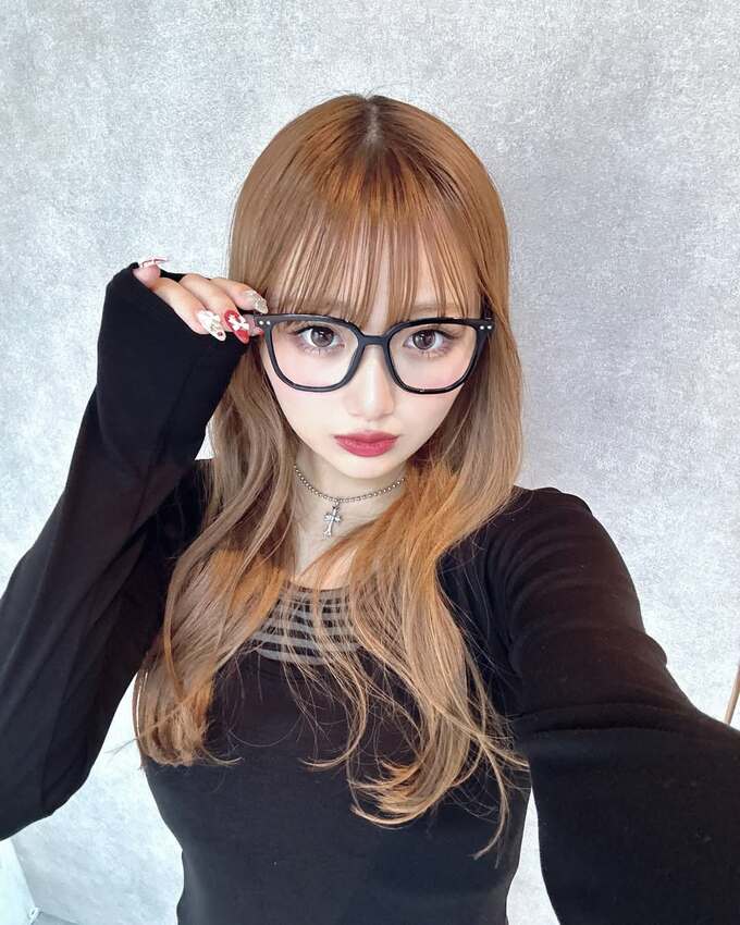 希空さんは濃いブラウンの髪を無造作に背中まで流しつつ、黒縁のメガネに薄い青みピンクのチークを足して、首元にはシルバーのクロスのペンダント、黒ニットのカットソーにワイドデニムとブーツを合わせて、キュートな顔立ちとクール目な着こなしのバランスで決めています。