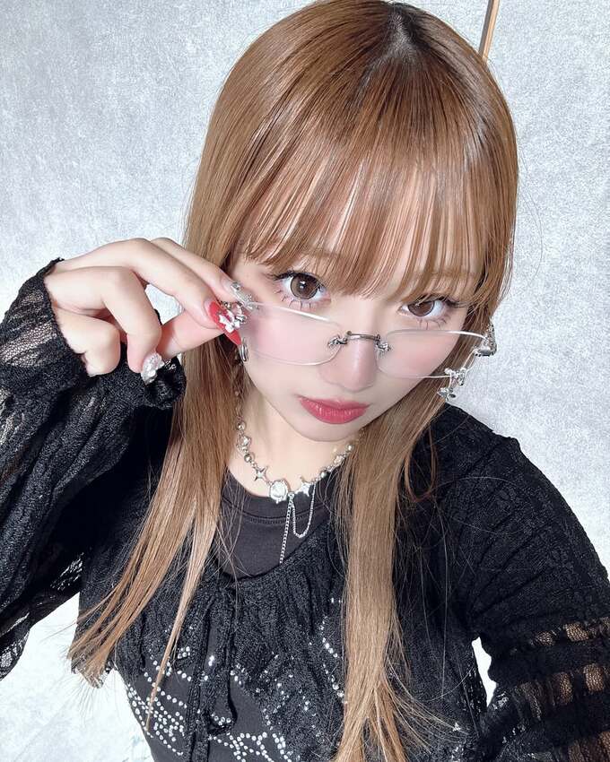 さらに続く写真では、縁なしクリアなメガネに黒レースのトップスとシルバーのネックレスを合わせて、軽めゴシックな雰囲気に。