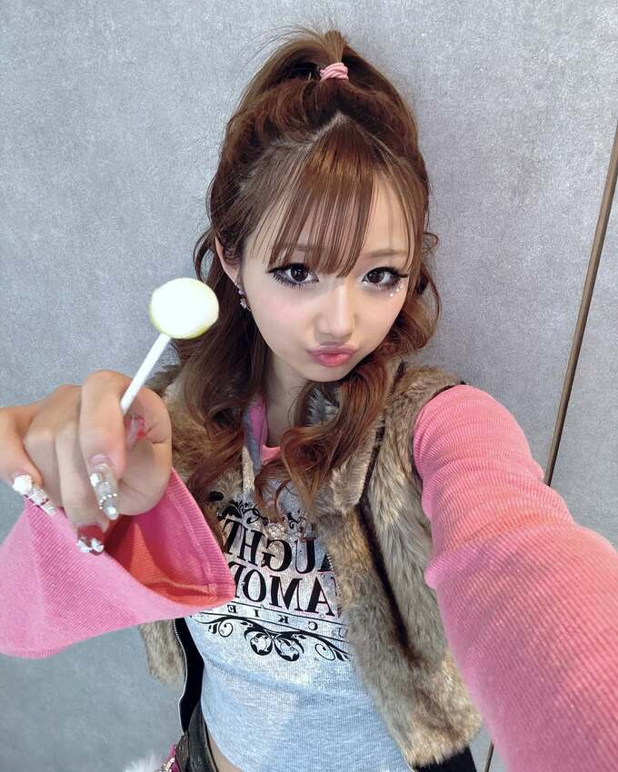 そして最後は、既報の “平成ギャル” ピンクのコットンニットとモスグレーのプリントTシャツにファーのベストを合わせ、目には特濃のアイラインと密集マスカラにラインストーンを配してキャンディーを掲げる、完全ギャル仕様の写真を投稿。