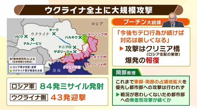 「これまでウクライナ東部・南部の占領地拡大を優先し、都市部への攻撃は行われず戦況が思わしくないため、都市部への無差別攻撃が続くのではないかと思います。今まで東部地域で戦闘に集中していたんですけども、クリミア橋の爆破がきっかけとなって全土の空爆に切り替えてきたなと思いました」