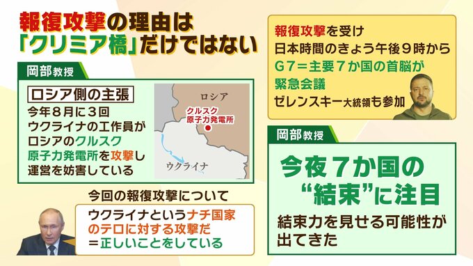 「ロシアの報道では頻繁に出ていまして、キーウで撮影された空爆の映像は、ロシアの国営テレビの映像を使っていまして、精密射撃で軍事施設、インフラ施設だけを攻撃していて、市民は攻撃してませんと、ロシアの放送局では全く正反対の説明がされています。実はロシアの国営通信によりますと、実は8月ぐらいからこのクルスク原子力発電所にウクライナの保安庁の人たちが破壊工作を企てて送電線を切断したと。そんなことが今回の報復の大きな要因の一つだというのをプーチン大統領が演説で話をしているんですね」