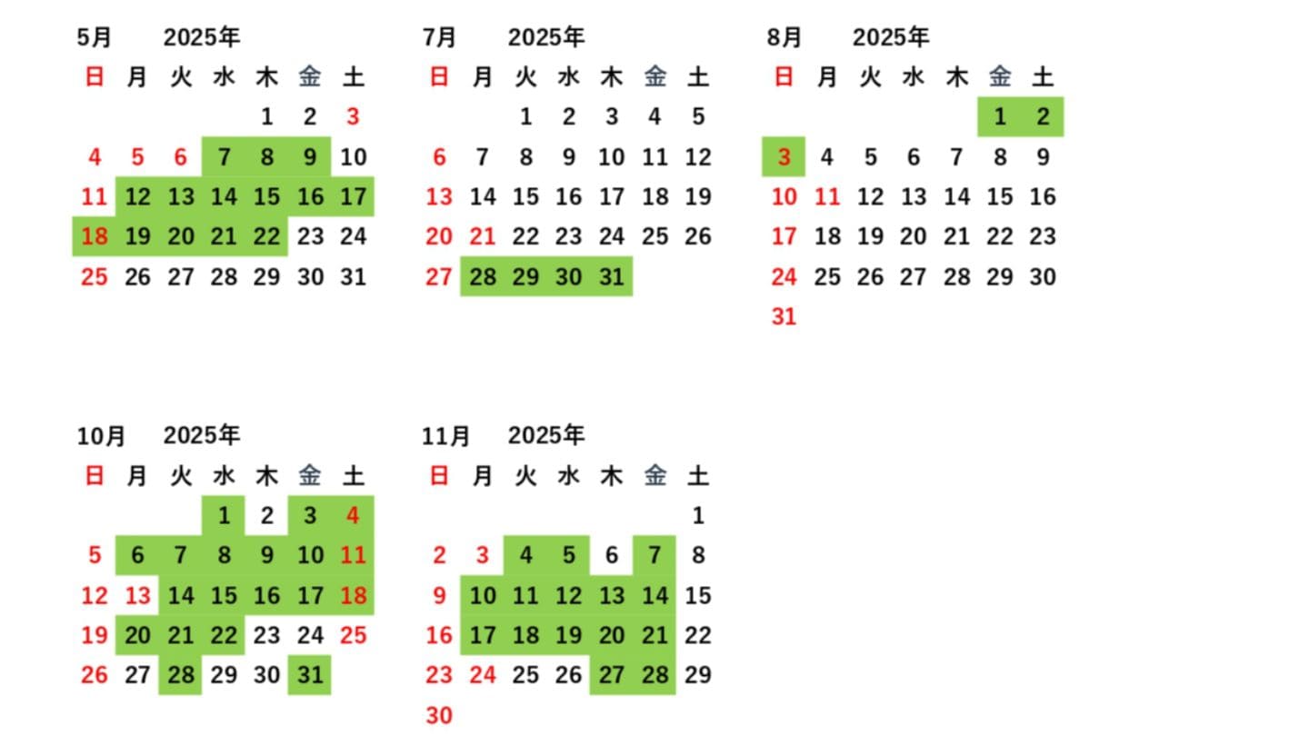 一日駅員を楽しめるのは、5月~来年1月の【画像④⑤】の緑色の日になります。なお、6月と9月の実施はないということです。