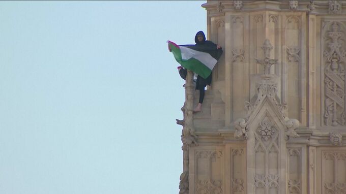 イギリス・ロンドンの観光名所「ビッグベン」に男がよじ登りました。男は、パレスチナ情勢への抗議活動をしていたとみられています。高い所に登り、パレスチナ自治区の旗を掲げる男。ロンドン中心部にある議会議事…