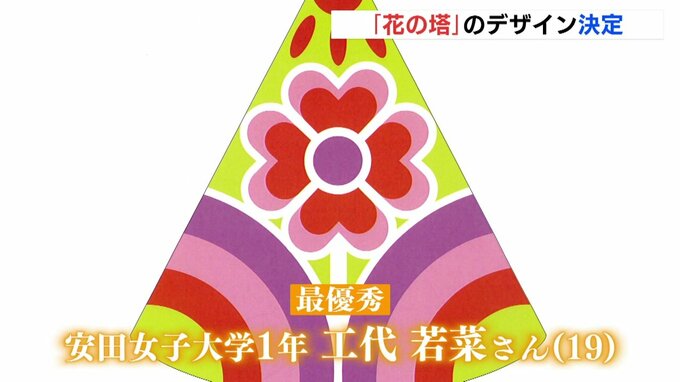 最優秀に選ばれたことしの「花の塔」のデザインは、安田女子大学1年の工代若菜さんの作品で「平和の種」から大きな「愛の花」が咲き、「平和のかけ橋」を虹で表現しています。