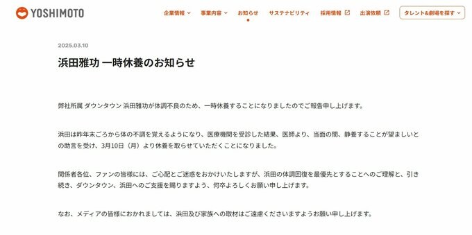公式サイトでは「弊社所属 ダウンタウン 浜田雅功が体調不良のため、一時休養することになりましたのでご報告申し上げます。」と、投稿。