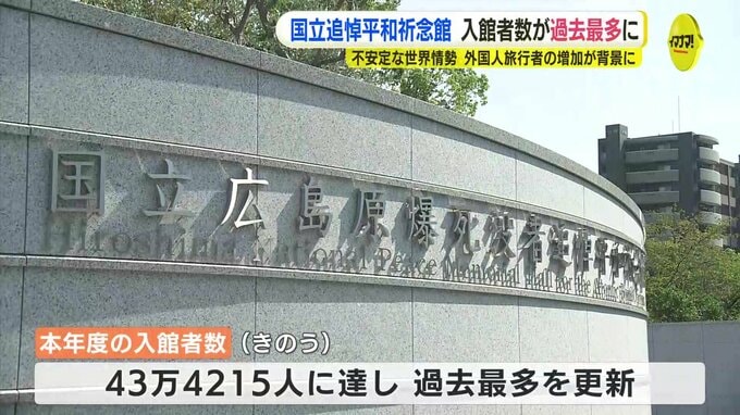 広島市の平和公園にある国立追悼平和祈念館の年間の入館者が、過去最多を更新しました。急激に入館者数が増加した要因について追悼平和祈念館は、不安定な世界情勢への危機感や、外国人旅行者の増加などを挙げてい…