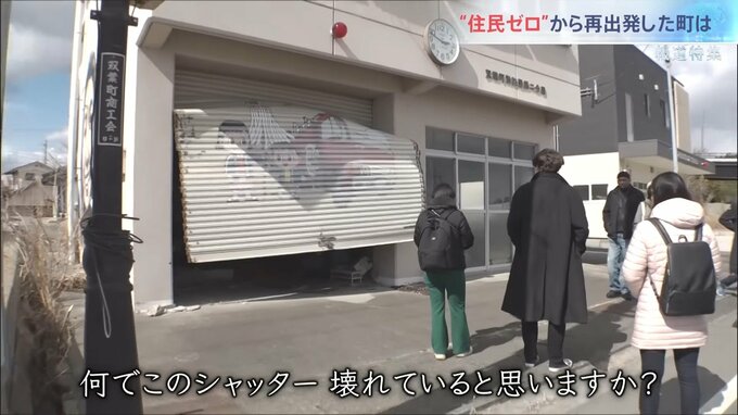 「何でこのシャッター、壊れていると思いますか?電気がなくなっちゃって、このシャッターが開かなくなっちゃった。津波が来るってなったときに、この中にあった消防車が中から突き破った跡です」