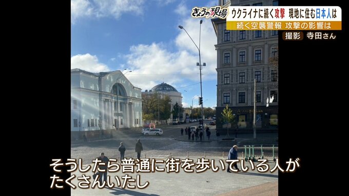 「爆撃のあった1時間後に家を出たんですね。そうしたら普通に街を歩いている人がたくさんいらっしゃったし、普通の生活をそのまま続けている人が多かったですね。キーウに住んでいる人たちにとっては(攻撃が)もう日常生活のようになっている。それが私の一番驚いたことですよね。(Q現在はどういう状況?)まったく何も変わらない。レストラン・カフェ・銀行・地下鉄、普通どおりなので。もちろん車も普通に走っているし。何も変わらないですよね」