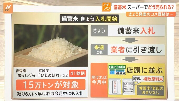 今後、備蓄米はどのように動くのか、その流れはまず10日に備蓄米の入札が開始。そして来週中に集荷業者に引き渡され、早ければ3月中に店頭に並びます。