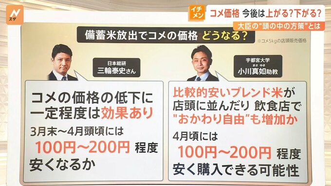 日本総研の三輪泰史さんは「コメの価格の低下に一定程度は効果あり。3月末~4月上旬頃には、100円~200円程度安くなるのではないか」と話しています。