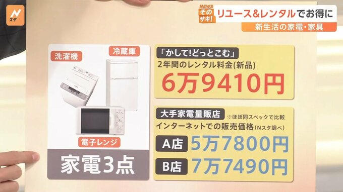 「かして!どっとこむ」で洗濯機・冷蔵庫・電子レンジ(新品)を2年間レンタルした場合、料金は6万9410円です。一方、大手家電量販店のインターネットでの販売価格は、A店では5万7800円、B店では7万7490円でした。(ほぼ同スペックで比較)