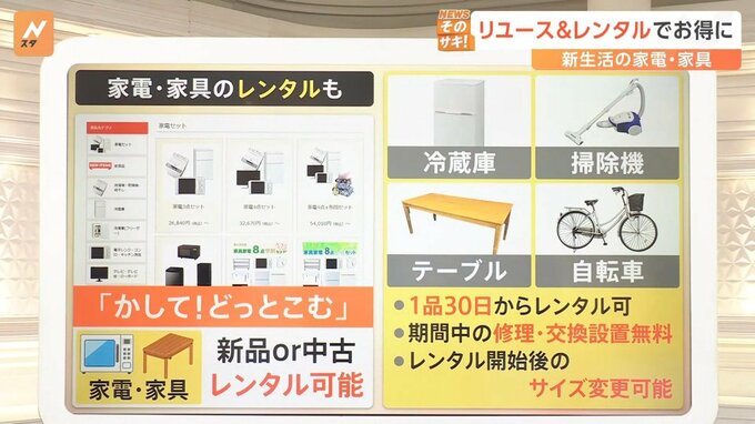 また、「かして!どっとこむ」では、冷蔵庫や掃除機、テーブル、自転車など、新品または中古の家電・家具レンタルをすることができます。新品か中古かは選択可能です。