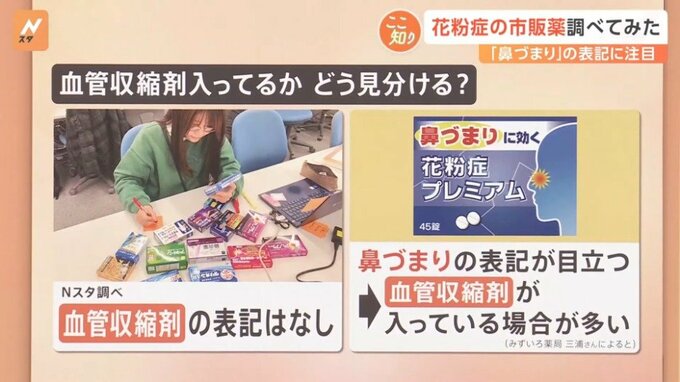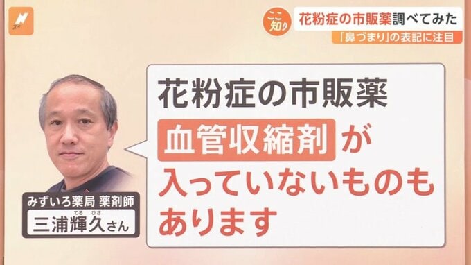 薬剤師の三浦さんによると「花粉症の市販薬の中には、血管収縮剤が入っていないものもある」ということです。その見分け方を見ていきます。