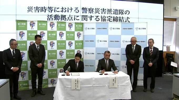 きのう(10日)締結式が行われ、香川県警の岡本本部長と四国地方整備局の豊口局長が協定書に調印しました。大規模災害発生時に、県外からの警察災害派遣隊の拠点として国立讃岐まんのう公園の駐車場と芝生広場が利用できるというものです。