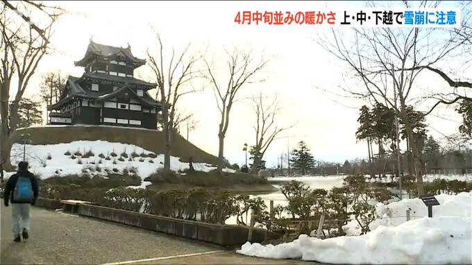 11日も新潟県内は高気圧に覆われ、最高気温が15.0℃を超え4月中旬並みの暖かさとなっているところもあります。このあとも気温は上がる見込みで雪崩に注意が必要です。雪解けが進む上越市の高田城址公園です。暖か…