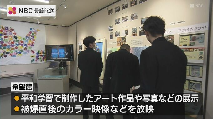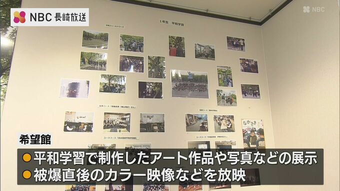 新しい施設では生徒が平和学習の中で制作してきたアート作品や活動時の写真の展示に加え、被爆直後のカラー映像が放映されています。