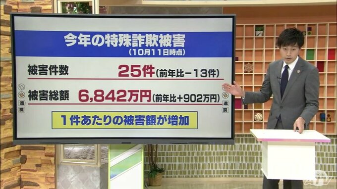 被害件数が25件で、去年の同じ時期より13件減っていますが、1件あたりの被害額が大きく、2021年より約900万円を増えています。
