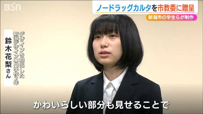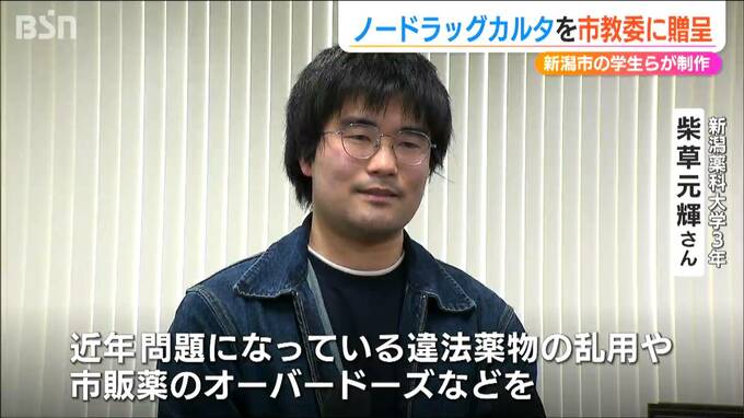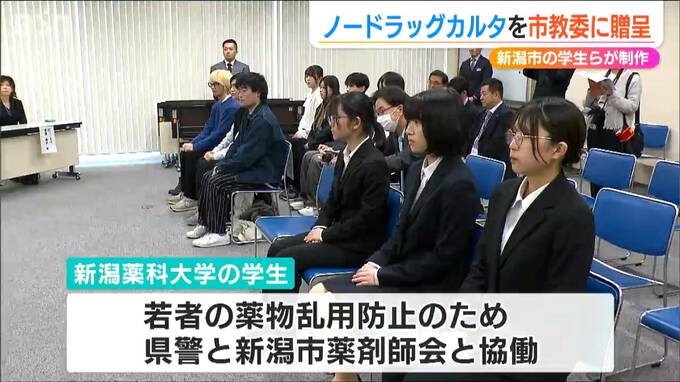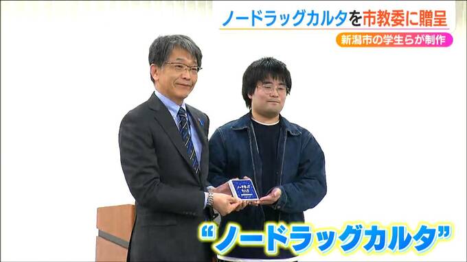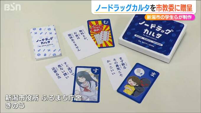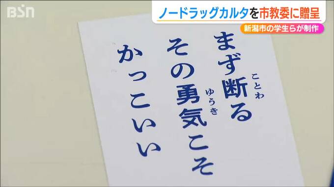 薬の正しい知識を学び薬物乱用を防ごうと新潟市の学生らが制作したかるたが新潟市教育委員会に贈呈されました。